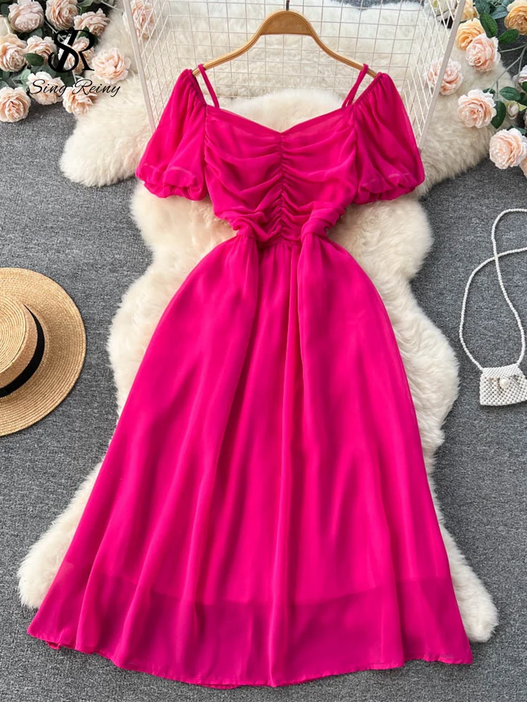 Singreiny Summer Korean Chiffon Beach Dress Puff Sleeve Folds Design Elastic Slim Women A Line Fashion Long Party Dress 2023 Dresses Aliexpress